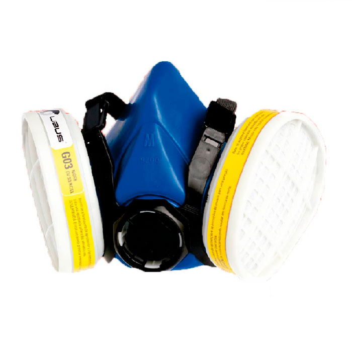Máscara respiratoria que cubre nariz y boca. Reutilizable y de bajo mantenimiento. Puede trabajar con filtros de partículas o cartuchos quimicos recambiables.